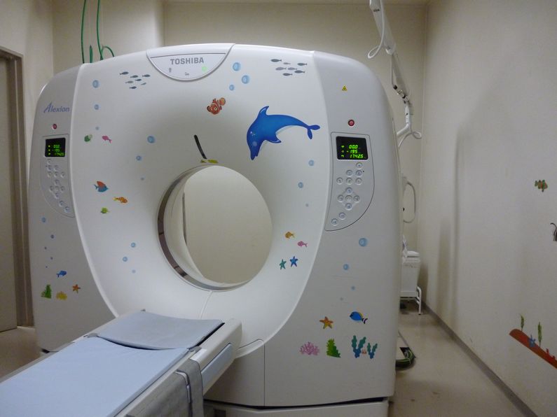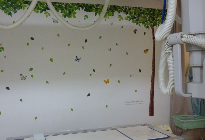 癒しのある空間を、と考えてシールが貼られたCT室やレントゲン室。クリックすると大きな画像を見られます。