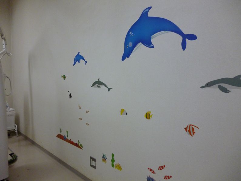 癒しのある空間を、と考えてシールが貼られたCT室やレントゲン室。クリックすると大きな画像を見られます。